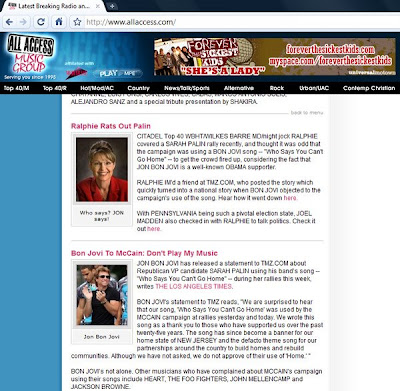 ALLACCESS.com wrote a quick piece on the story involving me informing TMZ that Sarah Palin was using a song by Bon Jovi at her rally.